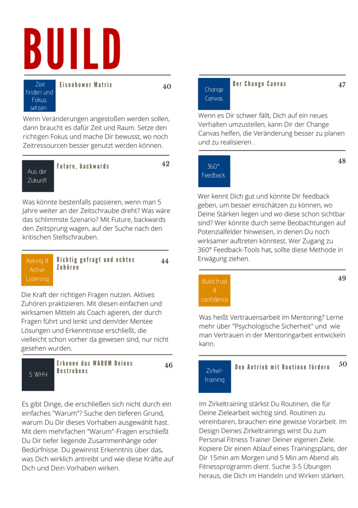 Build: Der Anfang ist gemacht, jetzt geht es los mit den Aktivitäten im Mentoring. Nutze diese Phase für die Planung des Mentorings und finde Klarheit über die Schritte, die man gehen oder anstoßen will?