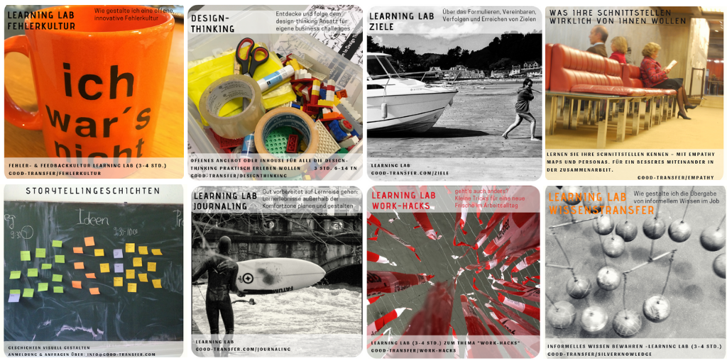 Informationen und Terminanfragen via info@good-transfer.com – Aktuell werden aufgrund von Corona keine Workshops angeboten. Eine virtuelle Begleitung/Coaching zu den Themen Wissenstransfer, Lernjournal, visual storytelling ist weiterhin möglich.